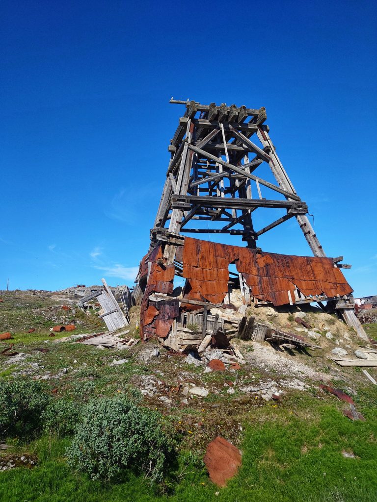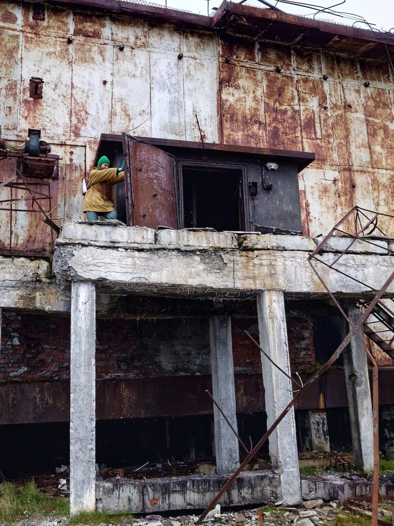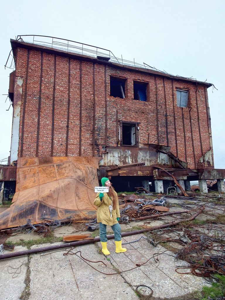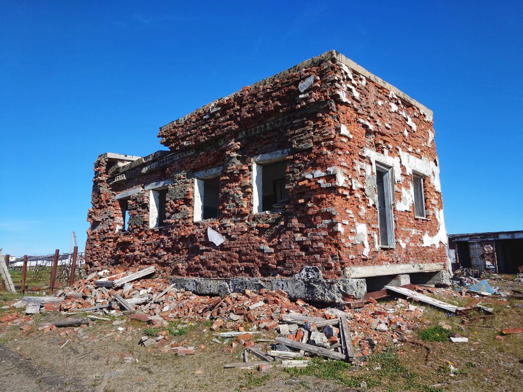 В Советское время стратегическое расположение Амдермы на северном морском пути накладывало отпечаток секретности, так на территории городка базировался с 28 августа 1956 года 72-й гвардейский истребительный авиационный полк, выполнявший задачи противовоздушной обороны. Помимо полка границы нашей Родины надежно охранялись «Леной-М» — радиолокационной станцией наземного базирования, разработанной в 60-ых годах прошлого столетия, которая являлась самым высокопотенциальным локатором радиотехнических войск ПВО за всю историю их существования со сложным зондирующим сигналом. Предназначалось сие сооружение для работы на протяжённых границах СССР — радиус действия порядка 450 км, размах крыльев — 70 метров. К сожалению, в 2024 году в рамках программы «Чистая Арктика» огромные антенны были спилены и увезены на «большую землю», сейчас станция выглядит, как обычная ржавая заброшка. Нам не хватило всего одного года, чтобы увидеть воочию эту монументальную конструкцию… Лестницы также подверглись демонтажу, поэтому сфотографировать внутреннее убранство теоретически, наверное, возможно, но мы не стали рисковать, ибо большинство объектов поселка пришли в полнейшую негодность: обвалившиеся полы, крыши и стены. Вся инфраструктура выведена из эксплуатации и стоит безхозной с начала 90-ых годов: первым перебазировался авиаполк, затем покинули Амдерму полярники и военные, а с разработкой искусственного флюорита была заброшена и шахта, давшая поселку жизнь.