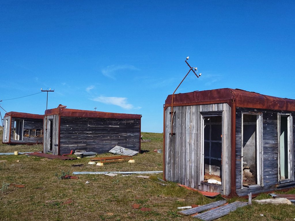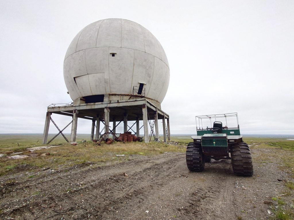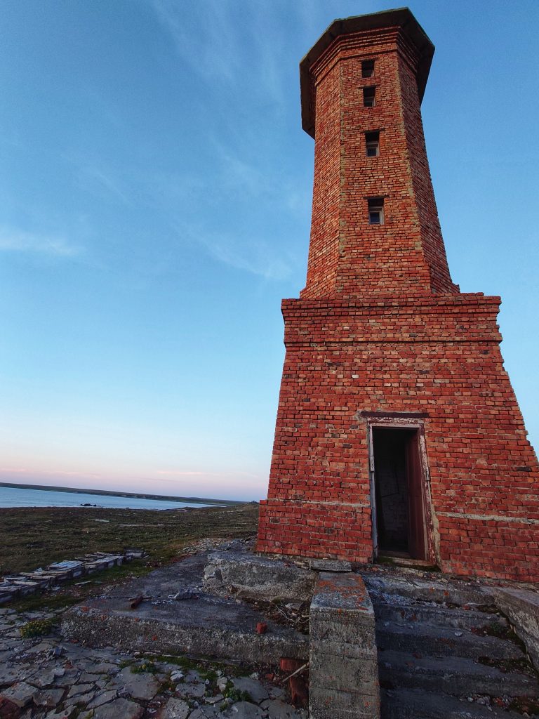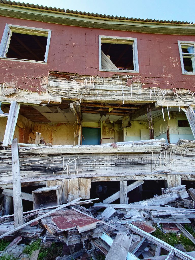В Советское время стратегическое расположение Амдермы на северном морском пути накладывало отпечаток секретности, так на территории городка базировался с 28 августа 1956 года 72-й гвардейский истребительный авиационный полк, выполнявший задачи противовоздушной обороны. Помимо полка границы нашей Родины надежно охранялись «Леной-М» — радиолокационной станцией наземного базирования, разработанной в 60-ых годах прошлого столетия, которая являлась самым высокопотенциальным локатором радиотехнических войск ПВО за всю историю их существования со сложным зондирующим сигналом. Предназначалось сие сооружение для работы на протяжённых границах СССР — радиус действия порядка 450 км, размах крыльев — 70 метров. К сожалению, в 2024 году в рамках программы «Чистая Арктика» огромные антенны были спилены и увезены на «большую землю», сейчас станция выглядит, как обычная ржавая заброшка. Нам не хватило всего одного года, чтобы увидеть воочию эту монументальную конструкцию… Лестницы также подверглись демонтажу, поэтому сфотографировать внутреннее убранство теоретически, наверное, возможно, но мы не стали рисковать, ибо большинство объектов поселка пришли в полнейшую негодность: обвалившиеся полы, крыши и стены. Вся инфраструктура выведена из эксплуатации и стоит безхозной с начала 90-ых годов: первым перебазировался авиаполк, затем покинули Амдерму полярники и военные, а с разработкой искусственного флюорита была заброшена и шахта, давшая поселку жизнь.